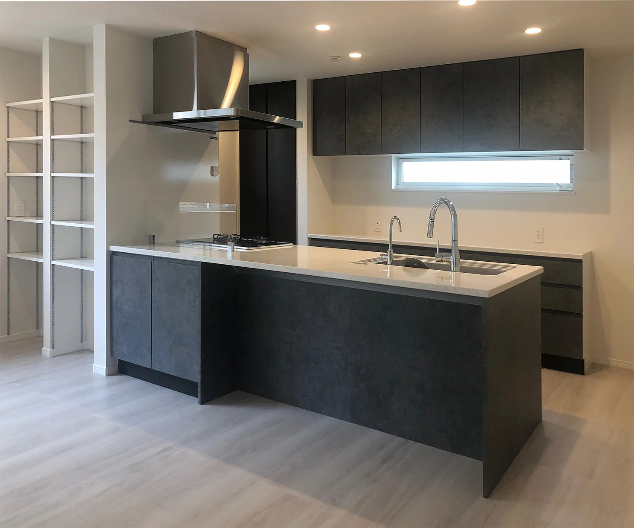 広々と使えるオープンキッチン、リビングにはタイルのアクセントウォールを使用。TVボード両サイドに大型FIX窓を採用。自然光の取り込みとデザインを合わせた設えとなっている。タイル面を上部から照らすことでタイルの陰影も楽しめるデザインとなっている。また、外観はスクエアを意識し凹凸を意識したサイディングの貼り分けとなっている。角地に位置する為、2方向のファサードとなっている。