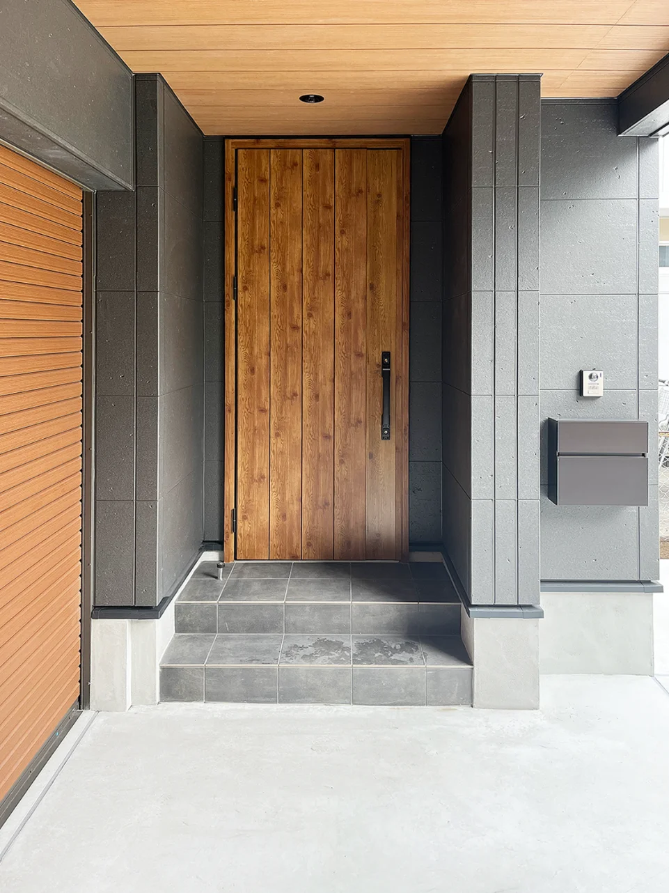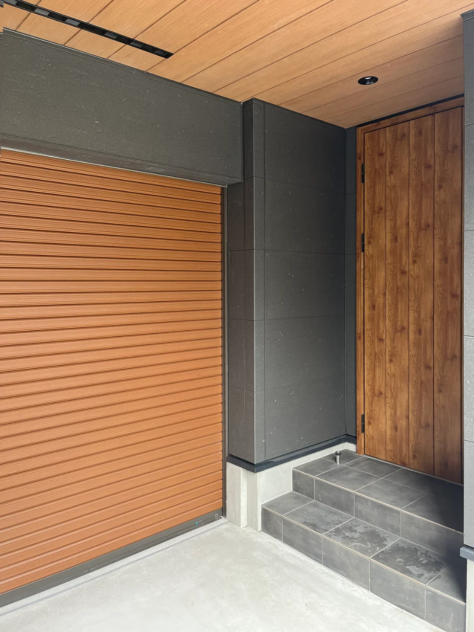 玄関は雨に濡れずに生活ができるよう、車庫入り口を利用した庇となっている。エントランス内部はビルトインとの繋がりを重視した設計となっている。大型FIX窓とテラスドアを採用し、濡れずに往来のできる動線を確保した。2階LDKの階段部には列柱を設け、ストリップ階段とすることで閉鎖感が無いよう間取りの構成をしている。リビング部天上にはピーリング材を貼り、TVボード裏にはタイルを設えた。また、上部にも間接照明を設置する等こだわりのある空間となっている。