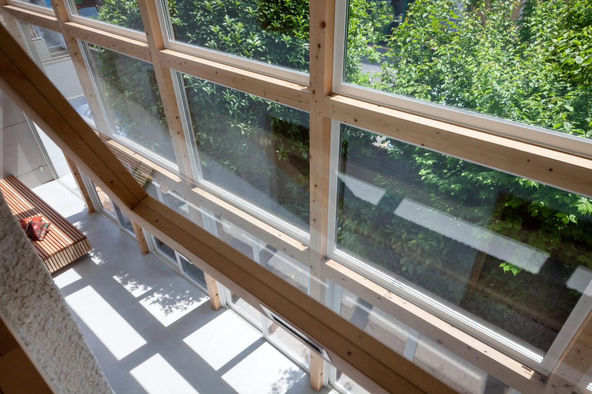 壁面を吹き抜けにし一面窓にした設計。中の外を上手に表現している。