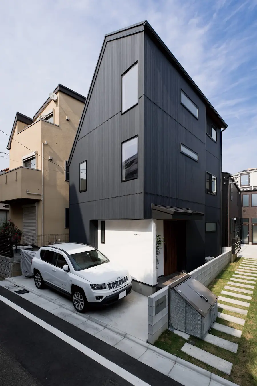 LDKの空間を最大限に活かした住宅。階段ホール・階段室を無くし、2階から3階へと続く壁面の本棚を設計。スケルトン階段と本棚を活かしたデザインを提案。キッチン・ダイニング上部にチーク材を設え、空間的にエリアを分けたデザイン。リビングから階段へと続く壁面には凹凸のある天然石を提案。キッチンにはペニンシュラタイプを採用。カップボードは引き違いの壁面収納内部に格納し、すっきりとしたキッチンとなった。玄関には間接照明を仕込み、来客をもてなすデザインとした。 シューズクロークにも取手のめだたない扉を採用し、シンプルな空間構成とした。3帖の洗面脱衣室には乾燥暖房機を設け、室内干しがいつでも出来るよう提案。洗面台上部にハイサイドの窓を設け、照明無しでも明るい洗面室とした。