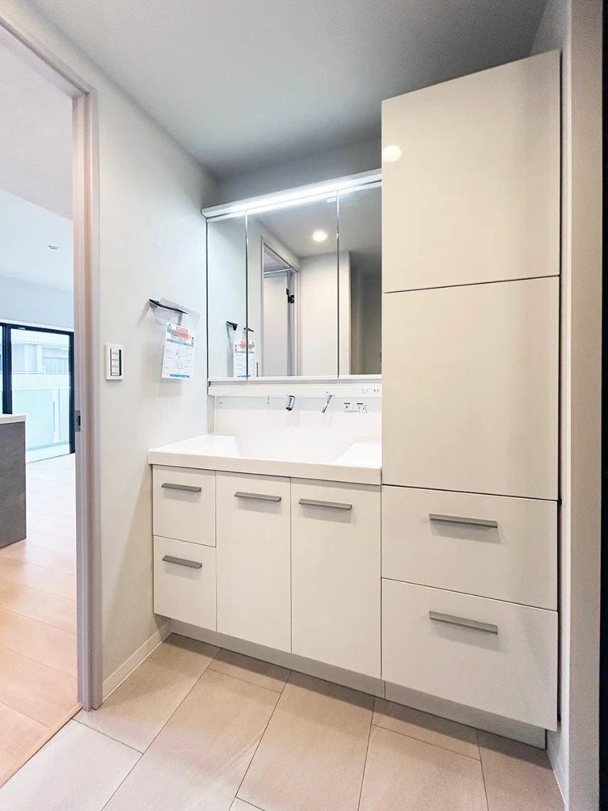 内装は同系色の色合いにてコーディネート。そのなかに光の陰影デザインをプラス。質素ながらにオシャレを醸し出す設計となっている。エントランスから続くホールにはシューズインクロークと廊下収納を配置。どちらも透過性のあるガラスを扉として採用。ガラスに映り込む室内や光が高級感を底上げしている。キッチン背面には、構造の梁を利用した間接照明を提案。落ち着いた雰囲気のLDKとなっている。