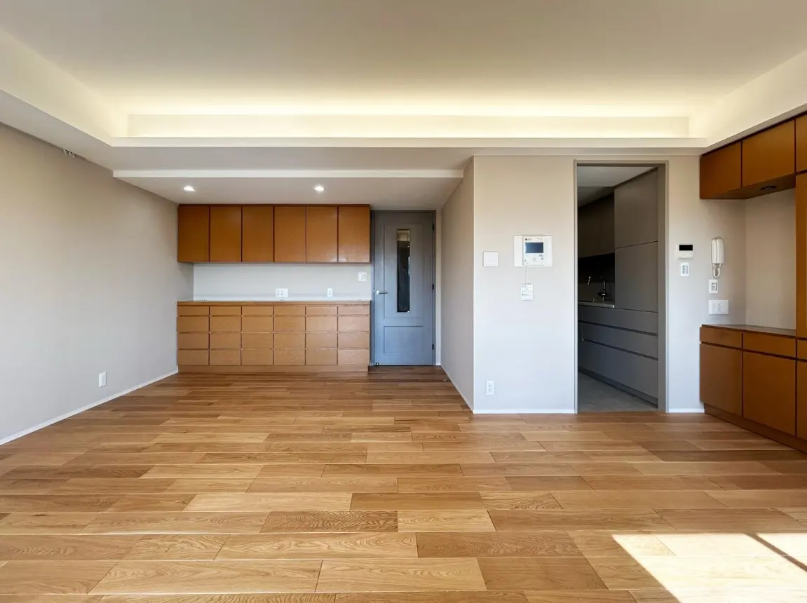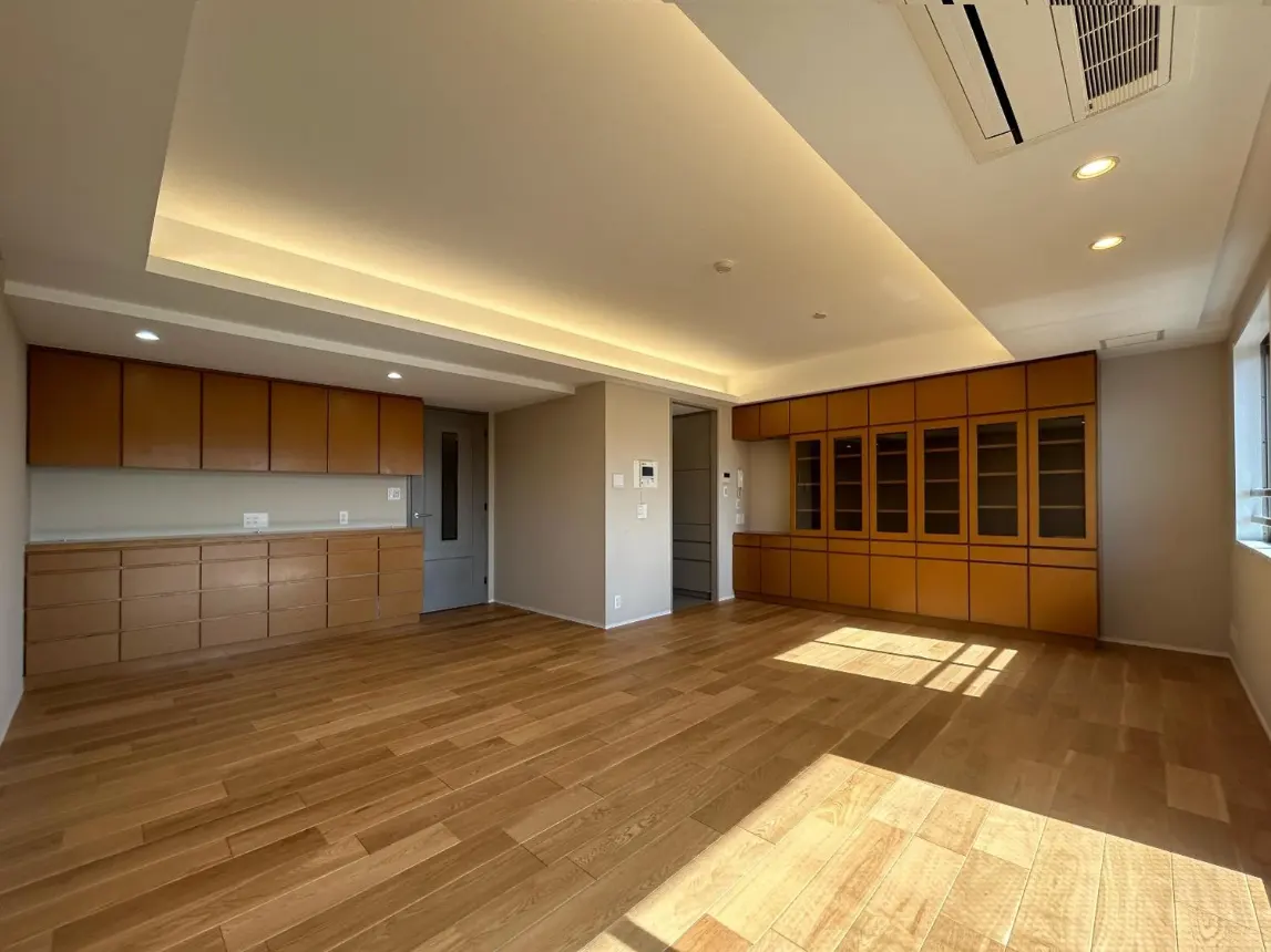 劣化した部分は刷新しつつ、価値のある要素を賢く残すことで、住まい全体が見違えるような空間に生まれ変わりました。美しい素材で仕上げた床と壁に、折り上げ天井と間接照明を巧みに取り入れたリビング。さらに、クオーツ製の天板が特徴のオーダーメイドキッチンが高級感を演出します。また、落ち着いた雰囲気を感じさせるグレイッシュトーンで統一された洗面所とトイレが調和し、モダンで高級感あふれる洗練された居住空間を実現しました。