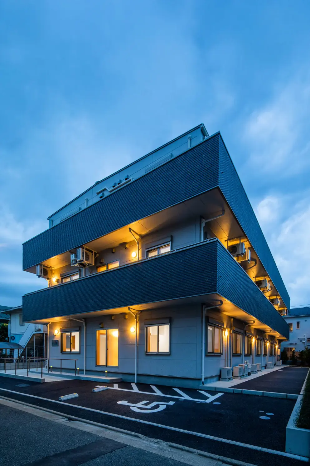 高井戸に建築されてたグループホーム。オフホワイトをベースにマットな紺色にて色調を調整。夜はライトアップにて、美しい表情が出るように設計。内装は明るく、淡い色味をベースに木調の扉等アクセントに採用。洗面等の水回りには掴まりやすく、ビビットな色を採用。使い勝手とデザインともこだわった設計となっている。