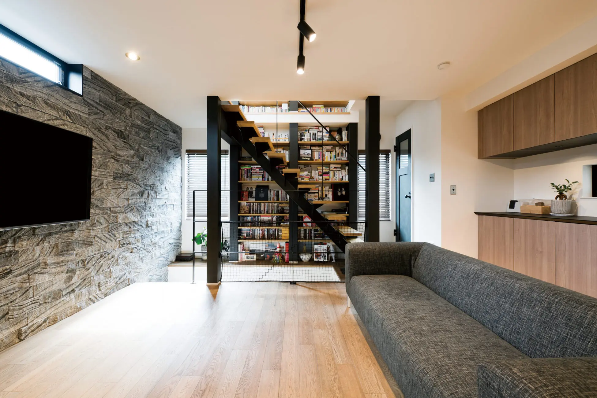 木目調の内装からあたたかみを感じるスケルトン階段の家