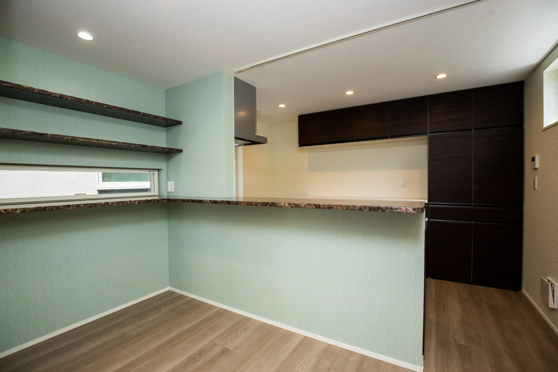 玄関のパステルグリーンが際立つ、吹抜けのある狭小住宅