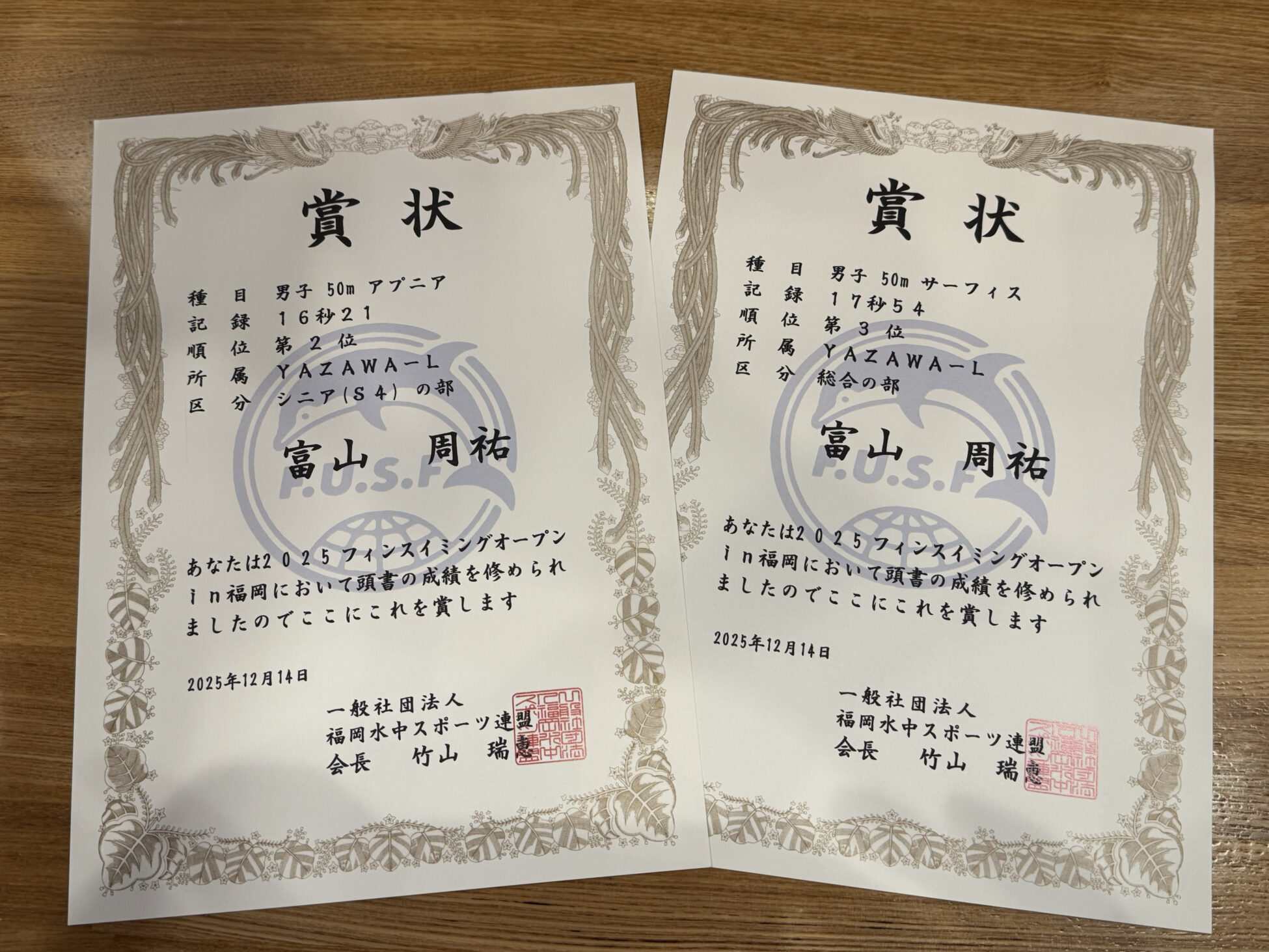 この度、2025.12.14 “フィンスイミングオープン大会 in 福岡“におきまして、当チーム所属の富山周祐 社員が、フィンスイミング50mサーフィスと50mアプニアに出場し
