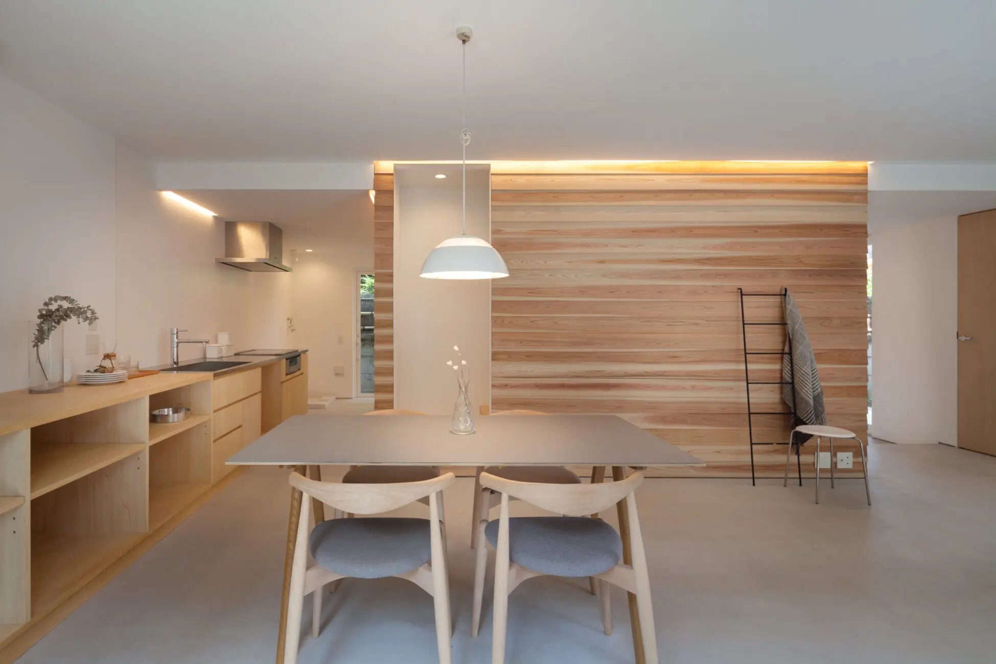 ナチュラルなダイニングは、シンプルながらも安らぎをプラスした空間です。壁付けのキッチンからダイニング、そして明るいインナーテラスへと続く開口は、光を多く取り入れる設計になっています。無垢材のウォールマテリアルは鎧貼りで凹凸を表現し、一面窓の吹き抜けによって中と外の一体感を感じさせます。スクエアな窓や一体型の収納棚、デスクが効率的に配置されており、折り上げ天井と間接照明が柔らかな光で和室を包みます。LDKから水回りのエリアまで続くデザインは、一貫したアクセントとなり、美しい空間を演出しています。外観は白い吹き付けと異なる素材感の外壁材、木の柵によるアクセントが調和するデザインです。